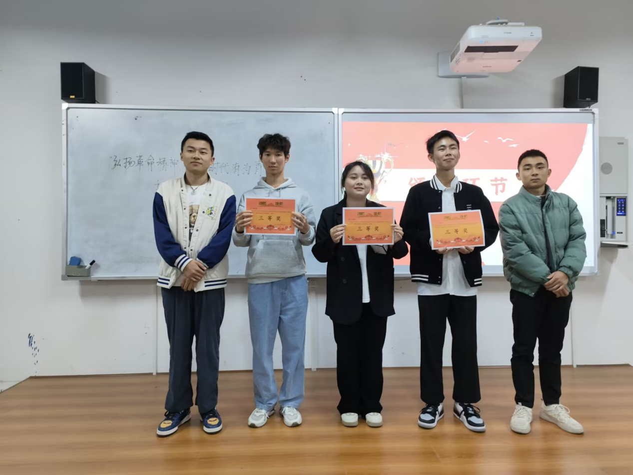 比赛结束,比赛获奖人员与评委合影。本次演讲比赛不仅传承了红色精神,也让同学们明白了当代青年勇于拼搏的责任与使命。