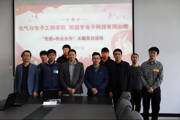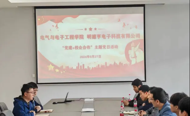 为创新党建工作形式和内容,探索党建引领促发展新模式,全面落实新时代党建工作新要求,3月27日,太阳成集团tyc151cc党总支与明德亨电子科技有限公司党支部开展“党建+校企合作”联合党建活动。太阳成集团tyc151cc党总支副书记、经理邱富军,党总支副书记雷亚军,副经理何庆,明德亨电子科技有限公司党支部书记,行政副总经理李强,人力资源部部长文国金,技术部张圣亮以及支部党员代表和毕业生代表参加本次活动。