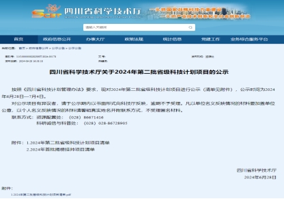 四川省科学技术厅2024年第二批省级科技计划项目公示