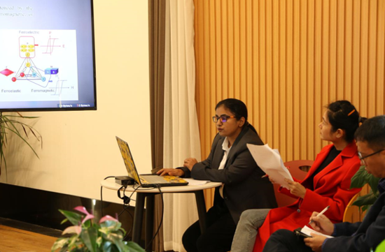 太阳成集团tyc151cc印度籍博士后Poorva Sharma,详细做了一次关于“钙钛矿”的前沿学术研究成果报告,重点介绍了多功能磁电重点实验室。Poorva Sharma博士表示实验室以新材料的研究为抓手,着力于培养员工探究能力,提高员工科研兴趣,增强员工研究素养。同时,Poorva Sharma博士热烈欢迎在座博士共同参与研究,实现合作共享。