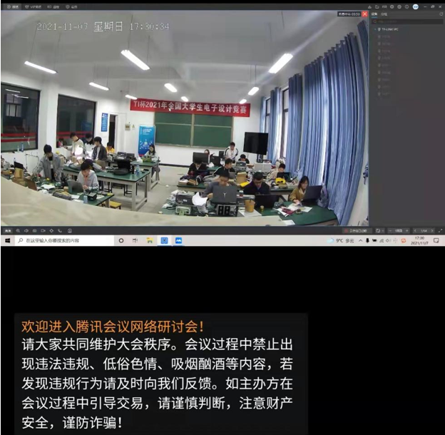 本次竞赛,从11月4日早上8点开始,到11月7日晚上8点结束,历时3天半。根据竞赛要求,参赛员工必须在3机位全方位监控下完成作品,队员之外任何人不能到场。确定选题后,从方案研定、电路设计、程序设计到作品安装、调试、报告撰写,不满足要求,又推翻重来。为了完成作品任务,参赛同学们夜以继日的奋战,克服了重重困难,最终完成竞赛作品。