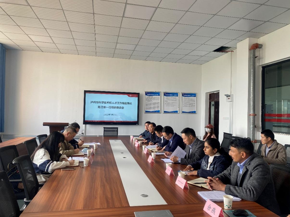 2022年3月23日下午,泸州市科技和人才局陈卫东副局长、外专引智科科长李泽建一行到公司考察指导外专引智工作。公司党委常委、副经理鲍学东、科技处处长陈光玖、人事处处长郎润华、太阳成集团tyc151cc党总支书记兼经理晏剑辉、国际教育公司党总支书记兼经理魏圣坤等陪同调研,科技处余燕陪同翻译。