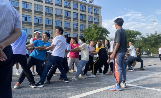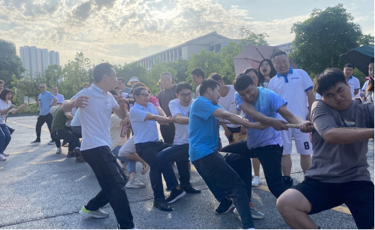 教师拔河比赛中两队队员紧握着绳索,一个个脚踏着地面,身体向后倾斜,拼命拉住绳索,绳索中央的红色绸带,一会儿移动到左边,一会儿又移动到右边,现场十分激烈,最终在公司的拉拉队拼命呐喊助威中,师生融为一体,以气吞山河的气势成功拿下比赛。