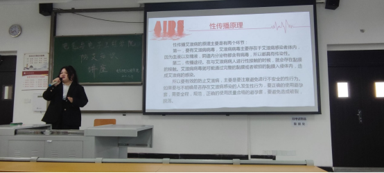 讲座开始,由防艾协会会员刘元绩进行防艾知识普及,感染途径首先向同学们提到了艾滋病的由来,传播方式以及艾滋病造成的后果,最后提到科学预防的方法,在场的同学们听后触目惊心,纷纷表示在今后的生活中定要科学预防,健康生活。