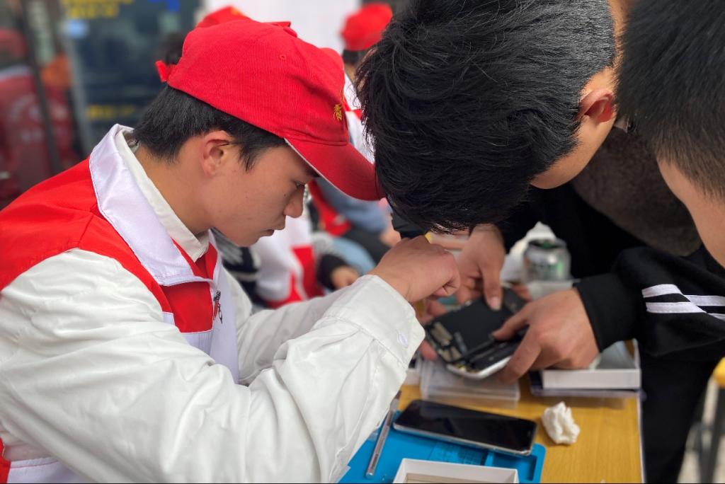 维修队志愿者当天早上7点到达维修地点,开展桌椅摆放、工具检查等准备工作。活动准时开始,送修同学络绎不绝。维修志愿者们热情接待,对维修电器进行井然有序编码并主动询问所送电器存在的问题。
