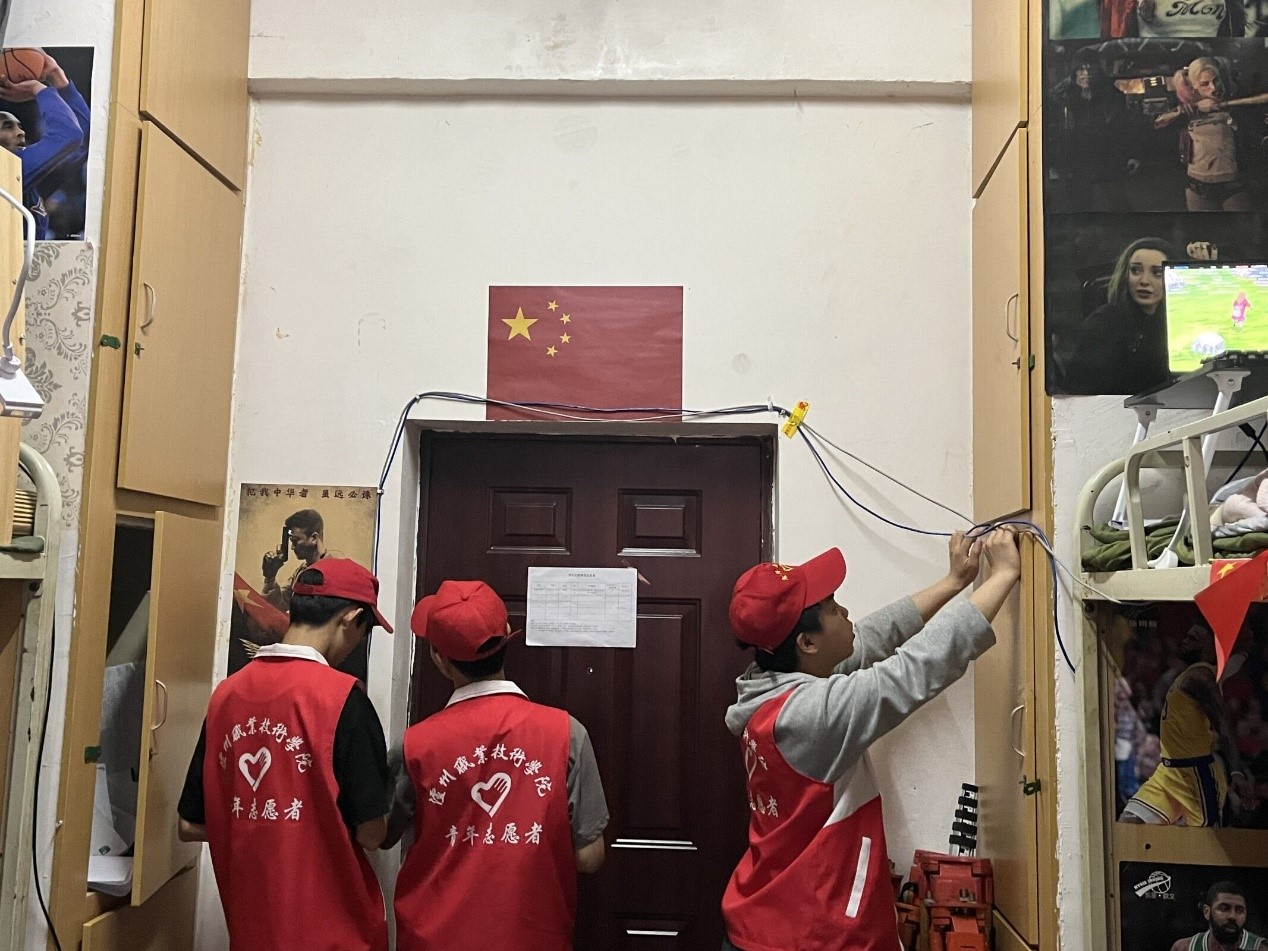 同学们认真检查五号楼宿舍布线,专业的电工对配电设施开展了用电隐患排查工作,对电线路开关、插座、漏电保护器进行拉网式安全检查,对存在老化、配置不合理、不合格等用电隐患的线路、保护装置提出整改意见,义务改造,进一步确保宿舍用电安全无忧。