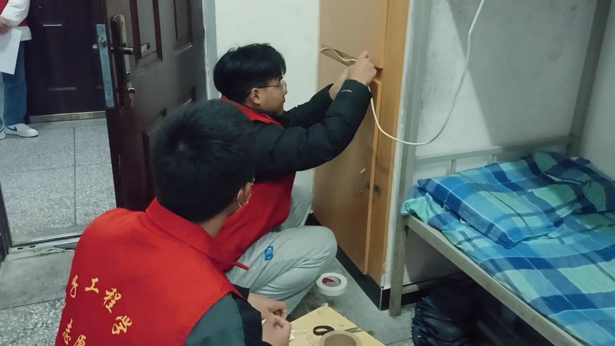 检查宿舍的过程中,志愿者礼貌地敲门询问同学们的寝室电路安全,并认真讲解着关于安全用电知识,对电线路开关、插座、漏电保护器进行拉网式安全检查改造,确保同学们在寝室的用电安全。