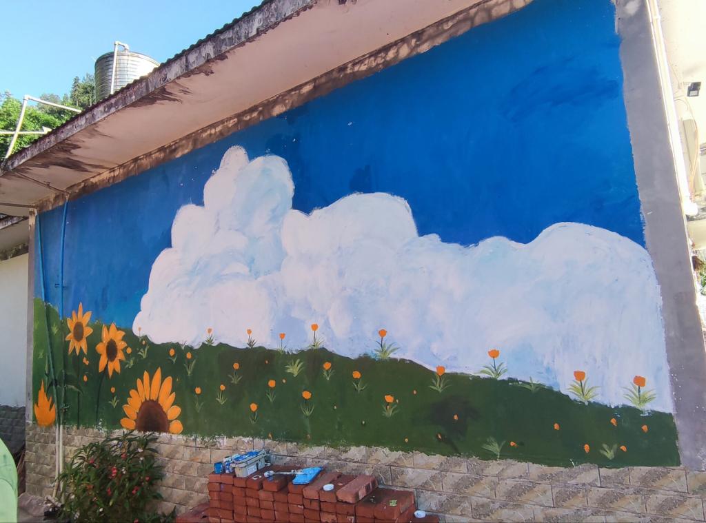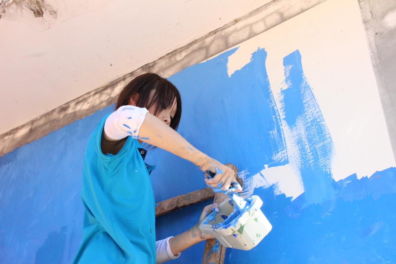 实践队队员与村干部探讨墙绘主题,队员们实地勘察制定墙绘方案,按设计稿在墙体打底稿、涂底色,结合专业所长,将充满农村生活气息融入多彩墙绘,融入到绿水青山和田园美景中。活动中,江禹禹等3位教师带领社会实践队成员合理分工,队员们在酷热考验下拿起各式画笔在墙体上细致耐心涂刷,墙面在队员努力下渐渐成型了。实践队队员胡月表示:“我们希望能通过这次墙绘活动为村上创造一个美丽而有趣的空间,让居民们感受到文化艺术的魅力”。