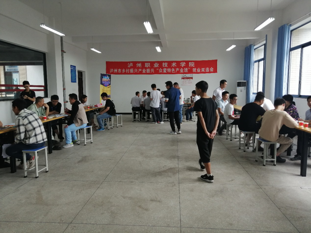 2019年6月18日下午由泸州市就业局、泸天化公司和电子工程公司联合举行的泸州市乡村振兴产业振兴“众爱特色产业班”专场招聘会在公司5410教室举行。泸州市就业局职介中心主任车轮和副主任蒋珊、泸天化公司经理曾庆双、电子工程公司书记兼经理晏剑辉、电子工程公司党总支副书记栗育琴及副经理邱富军到现场指导。