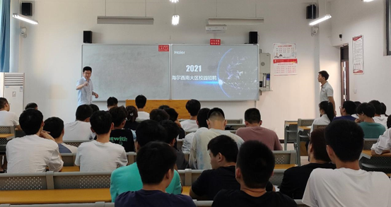 海尔集团刘经理与徐老师就本次招聘的岗位计划、人员素质要求、薪资福利,晋升空间等做了详细讲解。同学们认真听讲并踊跃提问和公司招聘人员进行互动,刘经理就同学们的提问做了详细解答。随后部分同学们投上了精心准备的个人求职资料。海尔集团招聘人员对提交面试申请的员工进行专场面试。