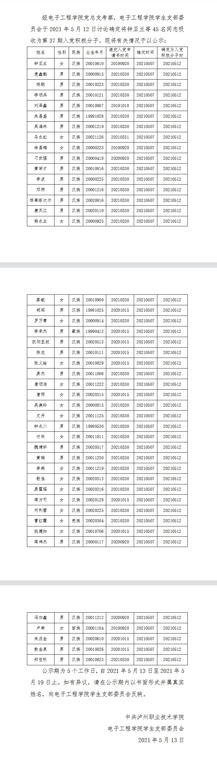 太阳成集团tyc151cc党支部第37期入党积极分子公示