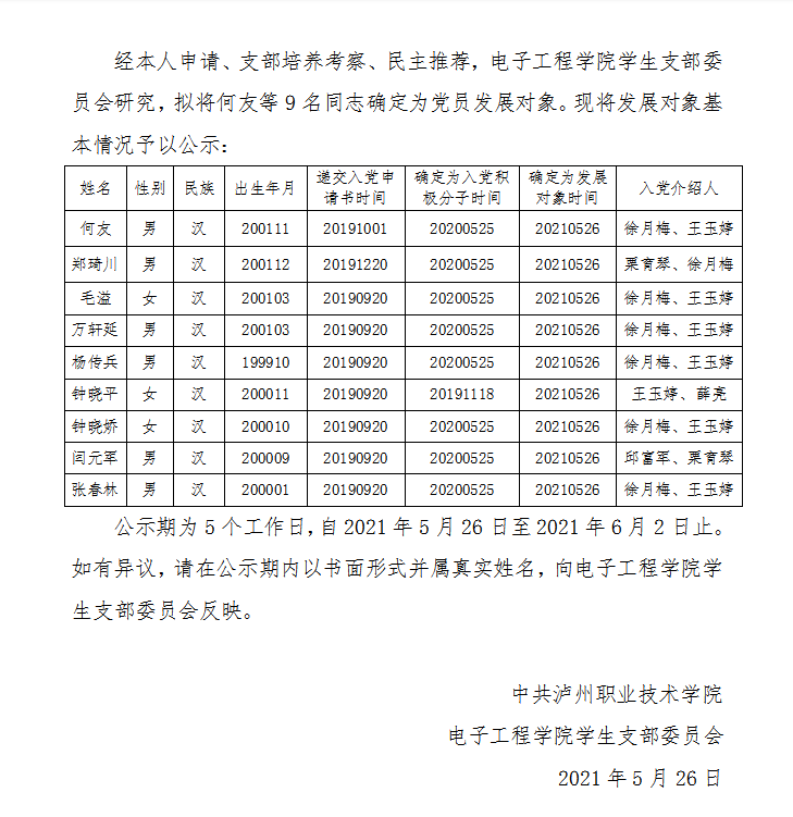 关于确定何友等9名同志为党员发展对象的公示
