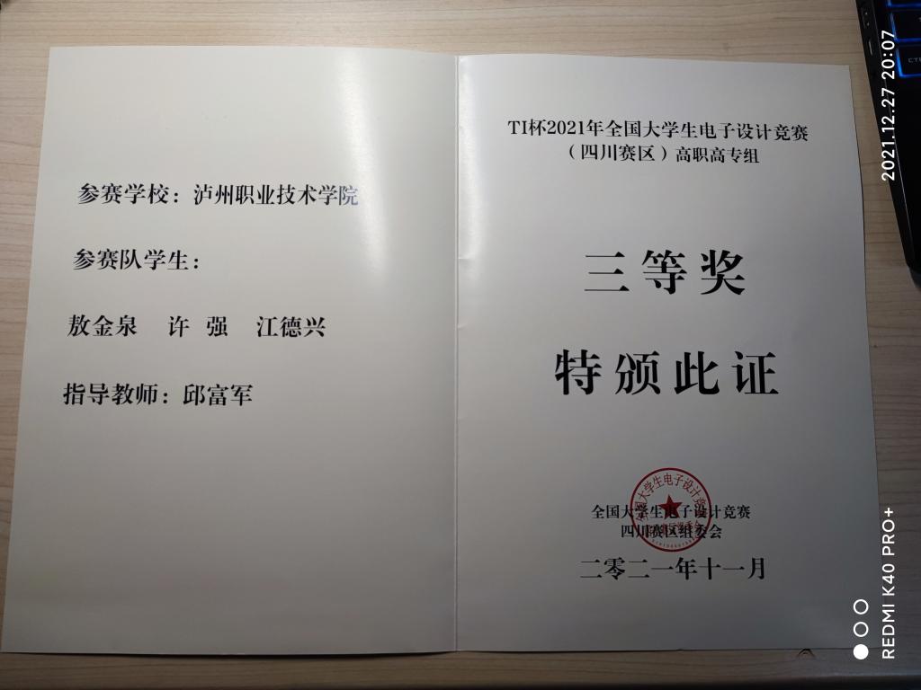 T1杯2021年全国老员工电子设计竞赛(四川赛区)高职高专组三等奖