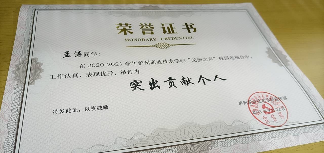 2020-2021学年太阳成集团tyc151cc“龙涧之声”校园电视台表现优异,被评为突出贡献个人