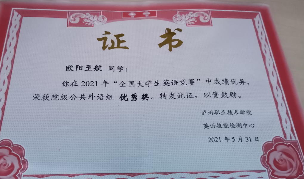 2021年“全国老员工英语竞赛”荣获公共外语组,优秀奖