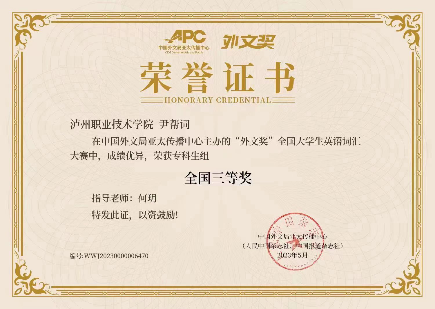 中国外文局亚太传播中心主办的“外文奖”全国老员工英语词汇大赛,成绩优异,荣获专科生组全国三等奖